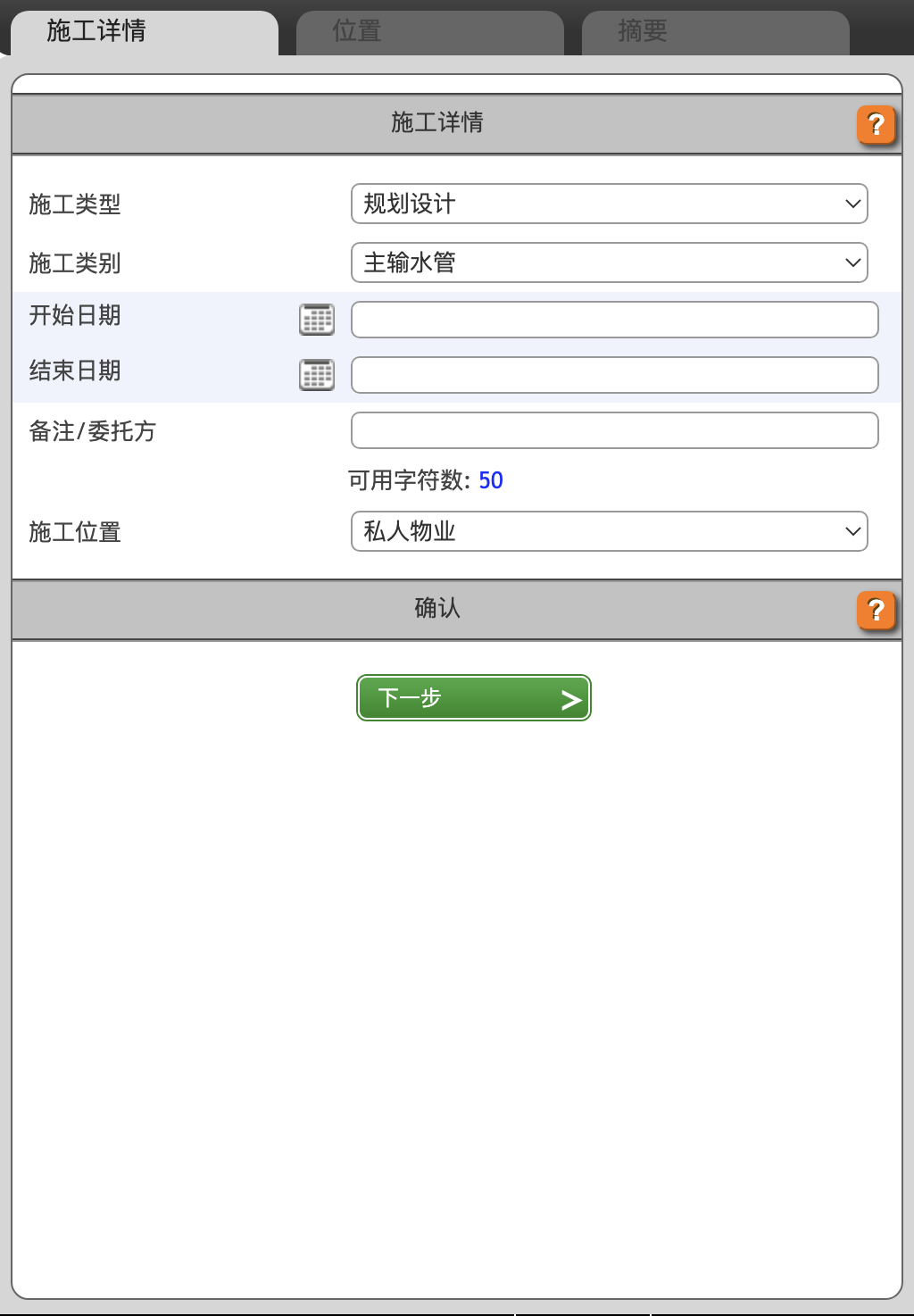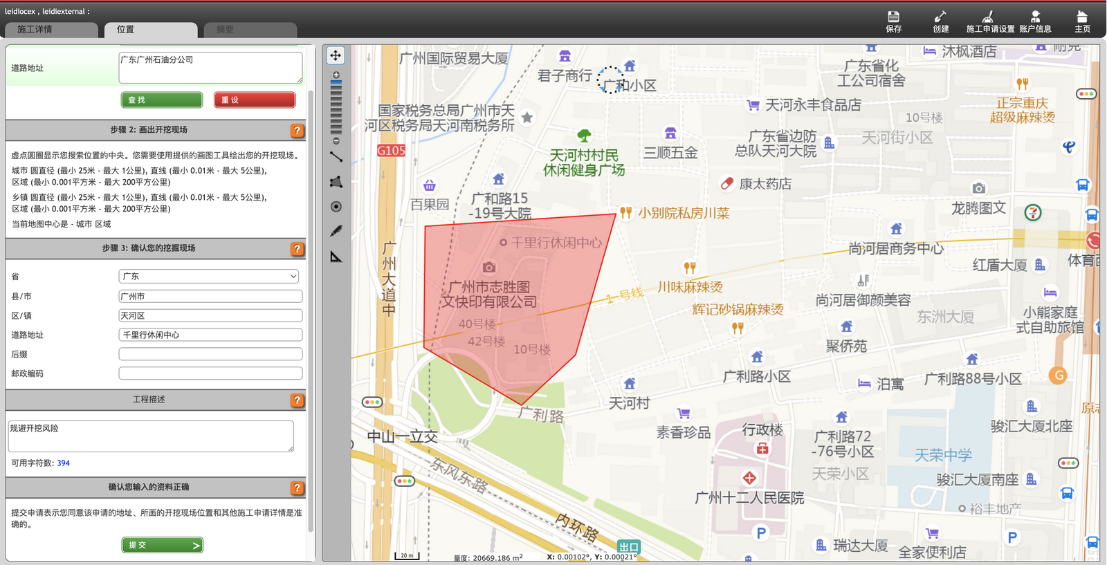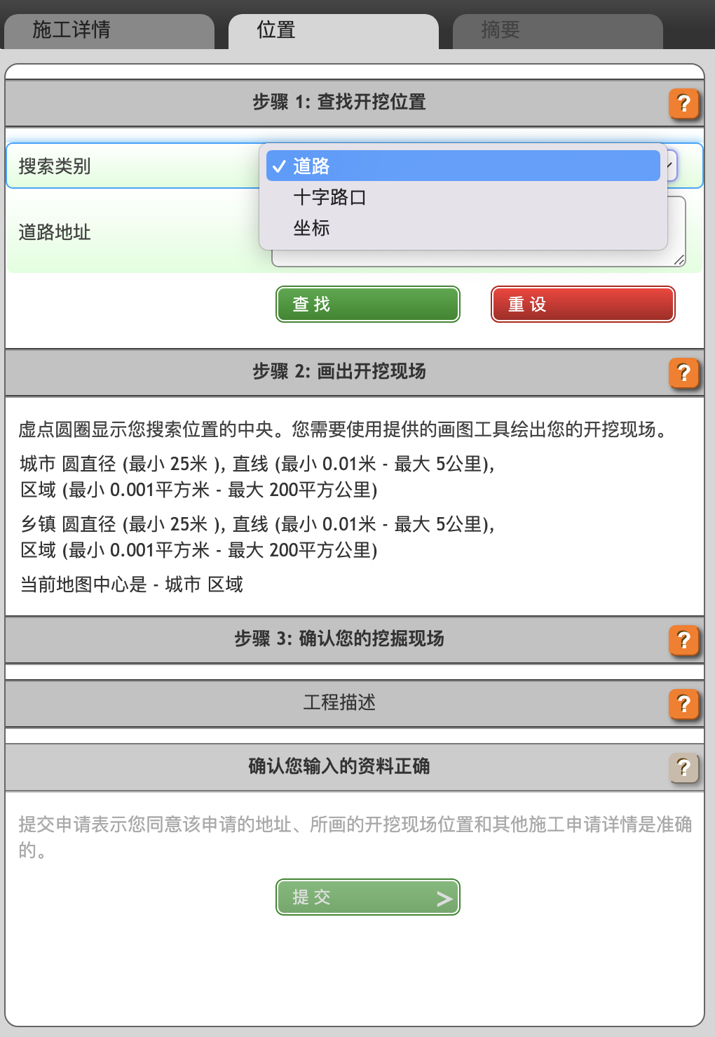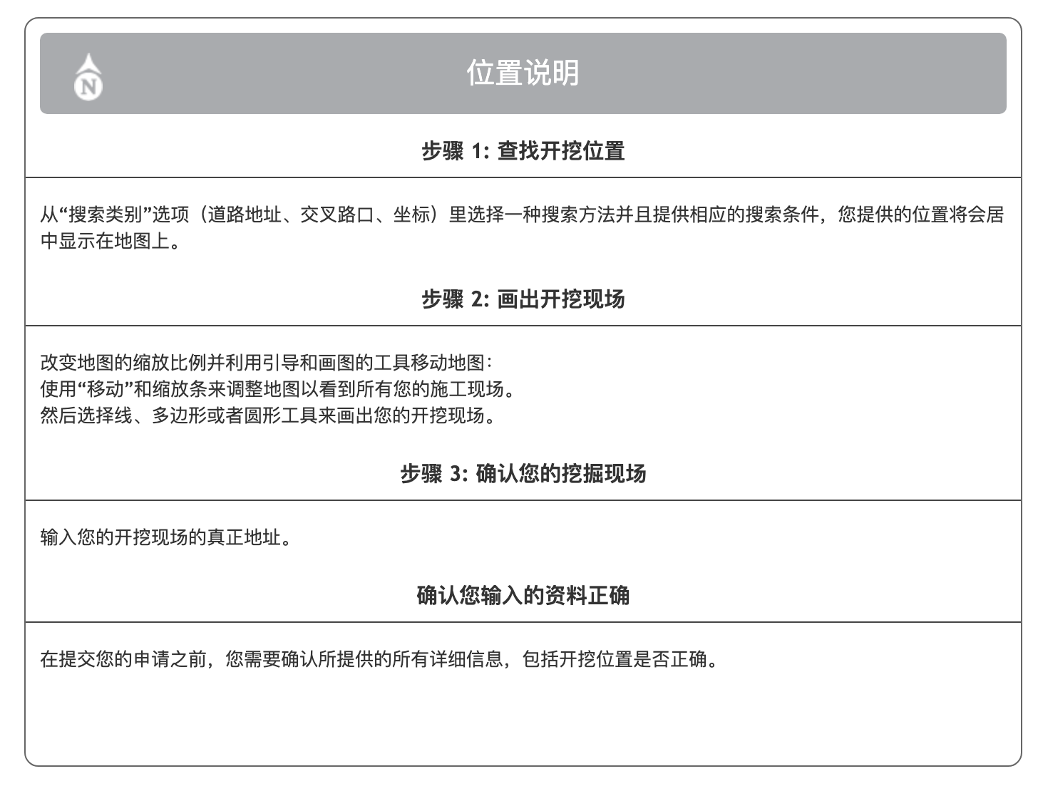 施工方首先提供项目基本信息,再告知大概的开挖作业地点,可以是简单的市区街道地址,或是更多的农村地区的GPS坐标,至少要提供足够的细节,以保证可以在地图上找到该区域。通知中心使用的基础地图越详尽处理的过程就越精准。